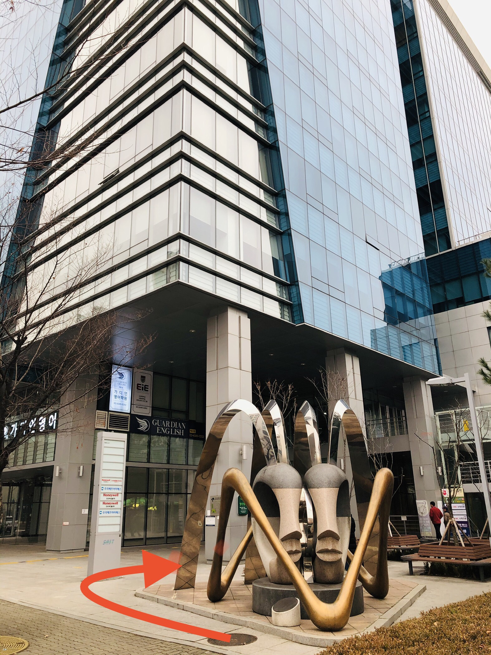 ビルの入り口前にモニュメントがあるので、これが目印です。