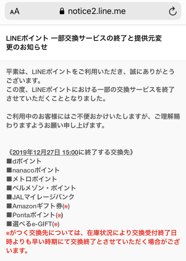 そんなポイントゲッターな私にLINEから悲しいお知らせが届きました。
