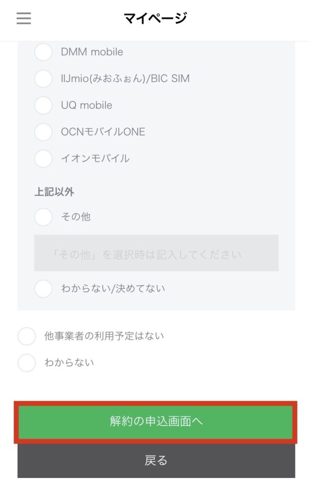 「MNP転出・解約」ページで「解約手続きをする」をタップ