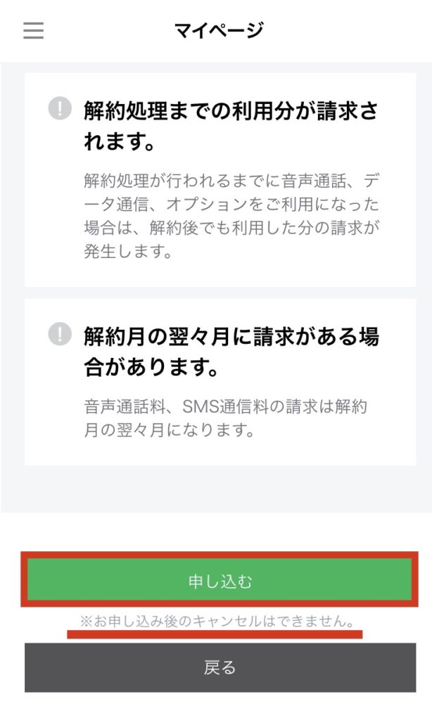最後に「申し込む」をタップすれば解約手続き完了
