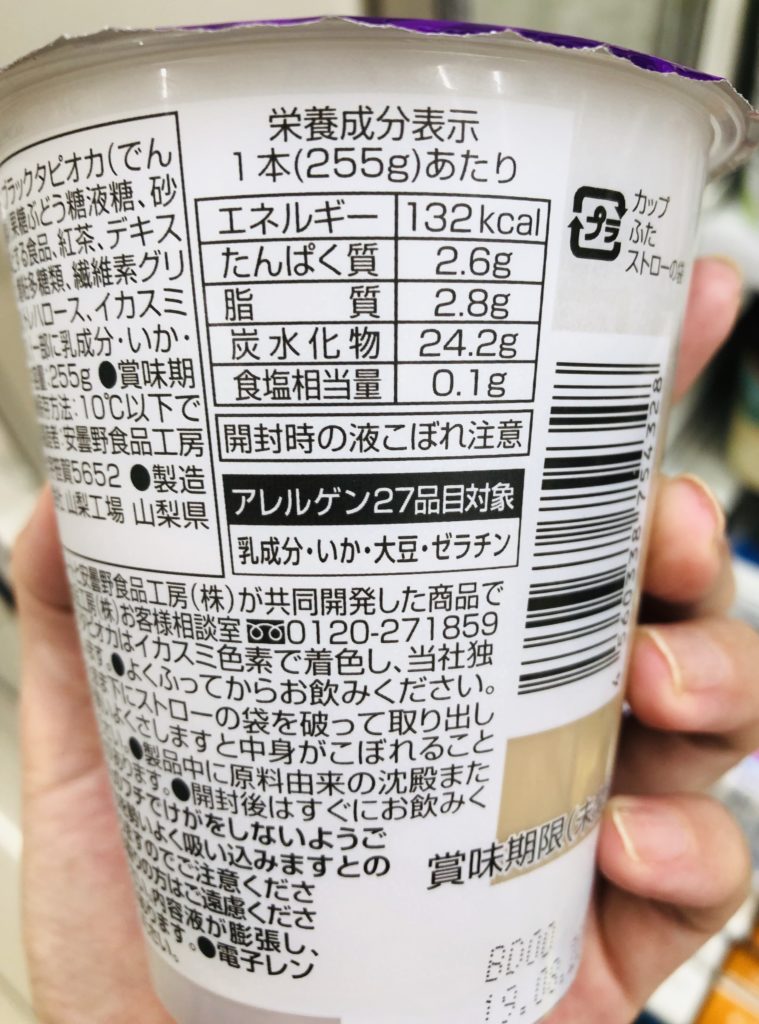 | タピオカミルクティー(255g) | 132kcal | 2.6g | 2.8g | 24.2g | 0.1g |